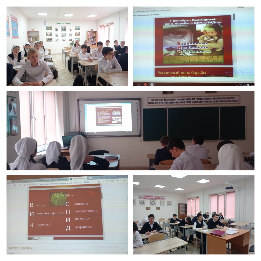 01.12.20221 декабря проведены классные часы- беседы, приуроченные Всемирному дню борьбы с ВИЧ- инфекцией: в 8 а классе( кл.рук.Кехурсаева С.В.);в 9 а классе ( кл.рук.Мускаеаа М.А.);В 10 а классе ( Эдилова М.М.).; в 5а классе( Абдулкаримов У.Х.).Цели:- сформировать представлены о болезни века;- познакомить обучающихся с основными сведениями о болезни и опасными особенностями ВИЧ- инфекции;- выработать поведенческие мотивации к сохранению своего здоровья.