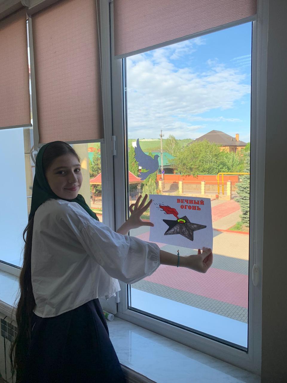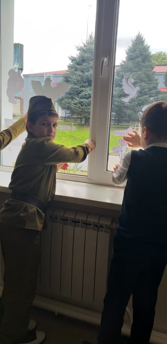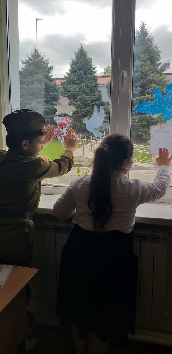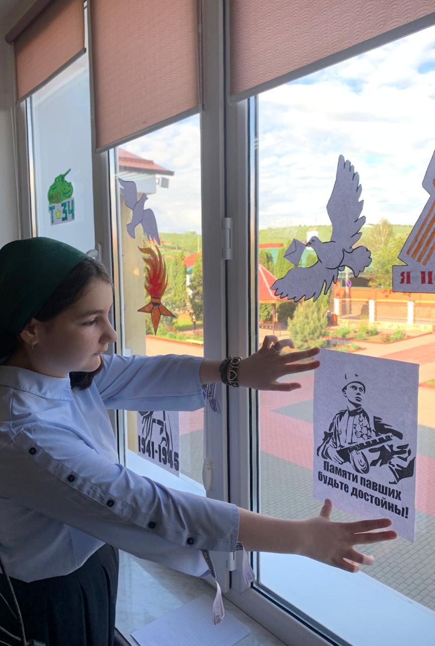 03.05.2023приуроченную 78- летию Великой Победы советского народа над фашистской Германией. " Окна Победы" - одна из акций, символизирующих стремление показать подвиг, который совершили наши предки в годы Великой Отечественной войны 1941- 1945 годов."Помнить тех, кто погиб, защищая свою Родину,помнить, какими усилиями и какой ценой досталась эта Победа- наш долг.Вечная память героям".Это одна из запланированных акций "Движением первых", - отметил Абдулкаримов Умар Хамидович, руководитель РДДМ "Движение первых" МБОУ "Ахмат-Юртовская СШ 1 им А- Х.Кадырова".