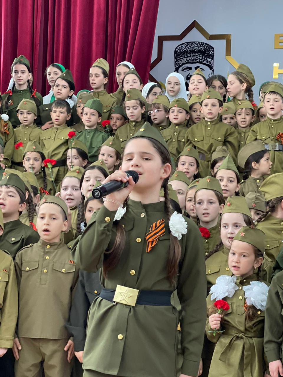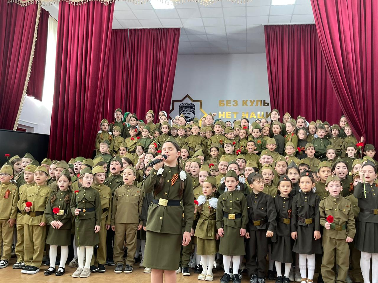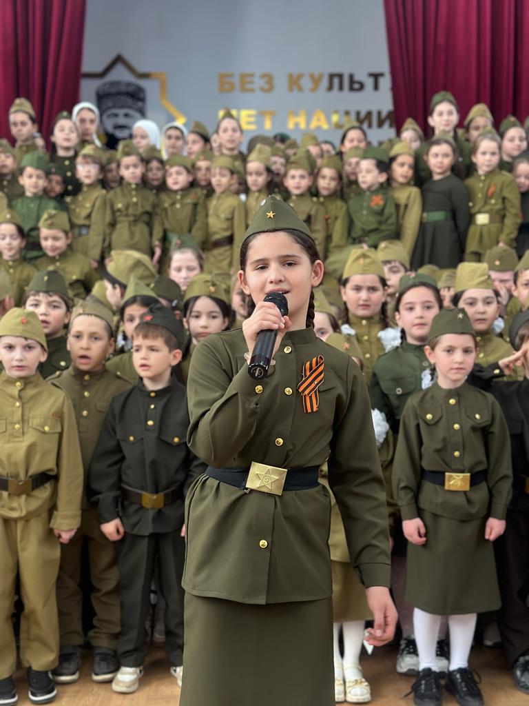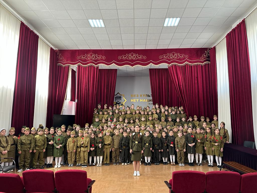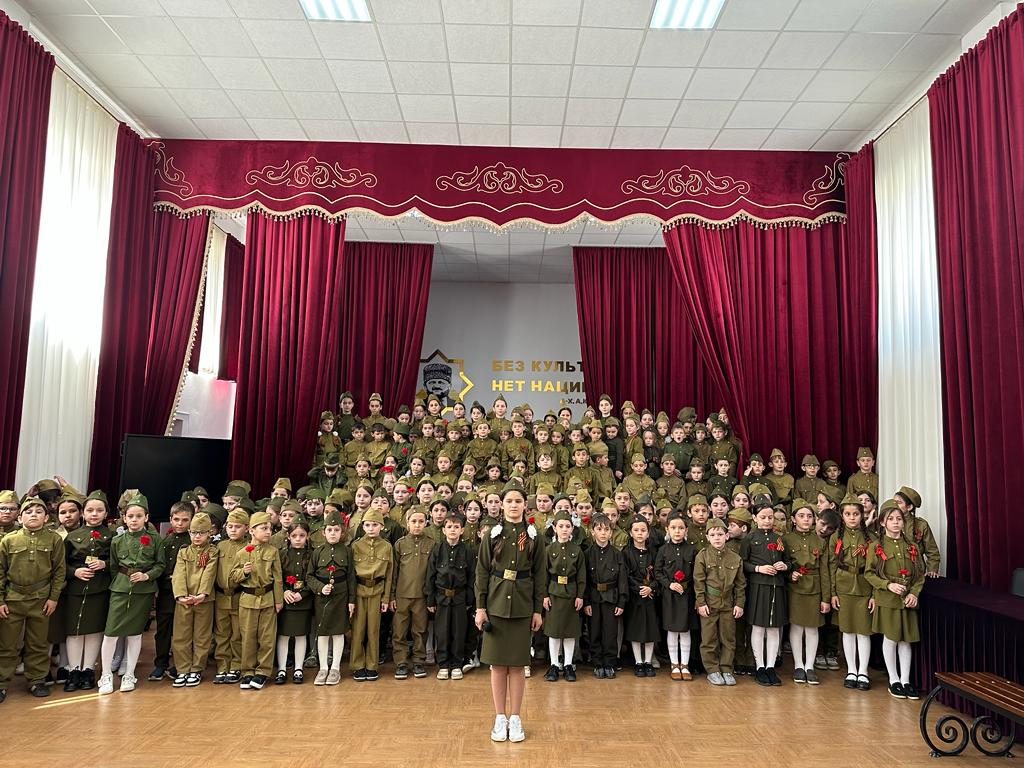 сводным хором школы из числа обучающихся 1- 7 классов, солист Садулаева Ясмина.Мероприятие было приурочено 78- летию победы советского народа в Великой отечественной войне." День Победы"- одна из самых популярных и ярких композиций из числа посвященных Великой Победе.