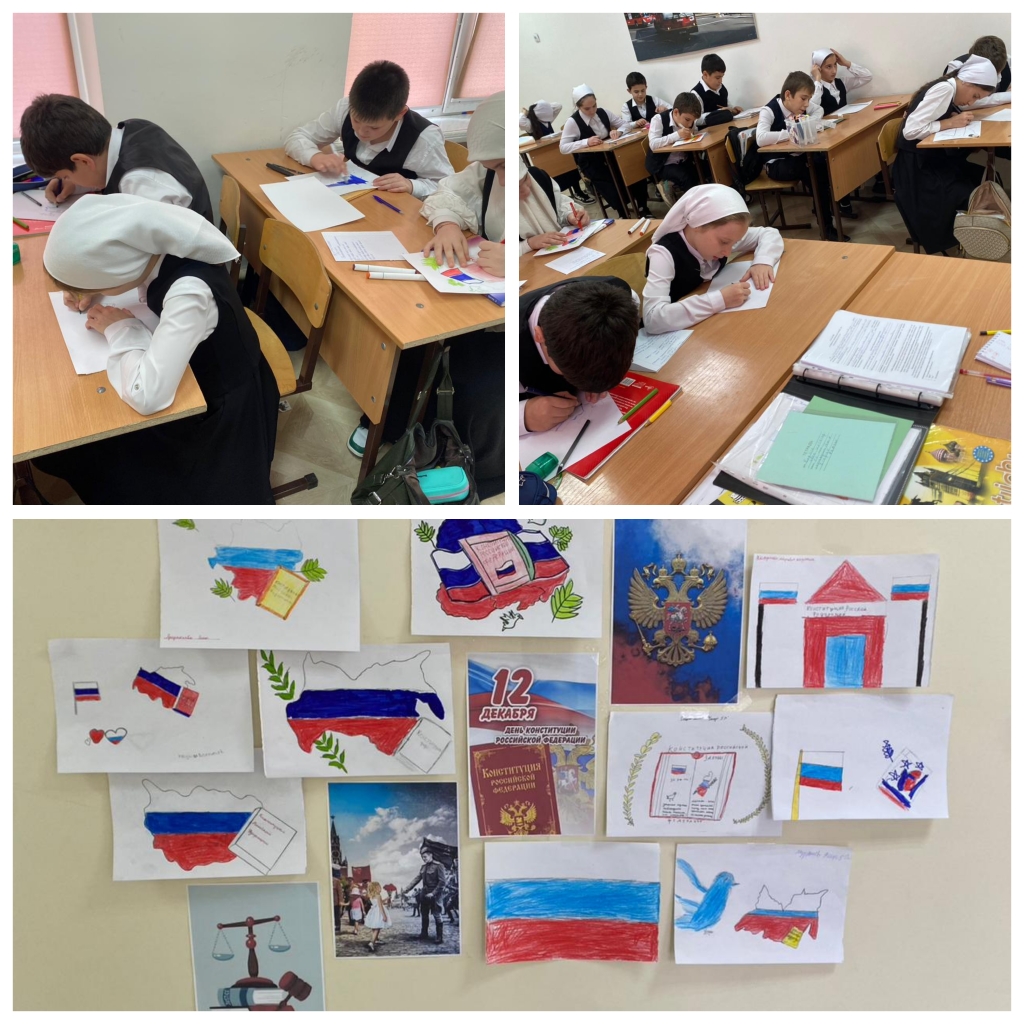 проведен учителем ИЗО Дагаевой Жайной Денилбековной организована выставка рисунков " 12 декабря- День Конституции РФ"