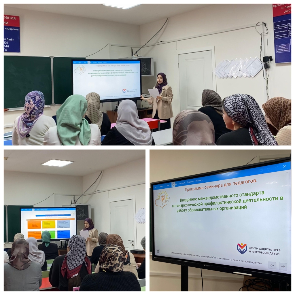 11.11.2025В МБОУ « Ахмат-Юртовская СШ№1 им. А-Х. Кадырова.» Педагогом-психологом был проведен семинар для педагогов: "Межведомственный стандарт антинаркотической профилактической деятельности: "Внедрение межведомственного стандарта антинаркотической профилактической деятельности в работу образовательных организаций" Цель семинара: Познакомить педагогов с основными положениями Межведомственного стандарта антинаркотической профилактической деятельности, определить их ключевую роль в системе профилактики, а также сформировать практические навыки и понимание возрастных особенностей в работе с обучающимися (7-11, 12-16, 17-18 лет). Целевая аудитория: Педагогические работники образовательной организации (учителя-предметники, классные руководители, заместитель директора по воспитательной работе).